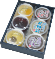 ゼリーは彩りもうれしい果実しぐれ。マスカット・びわ・白桃・梅・ぶどう・ラフランスの6種類。果実入りで爽やかな風味をお楽しみください。